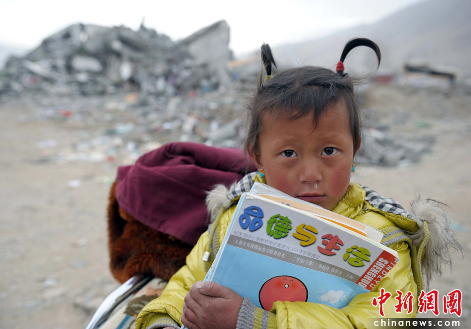 4月17日,一位上小學(xué)二年級(jí)的女童緊抱著自己的課本,站在震后的廢墟前。4月17日上午,青海省民政廳廳長(zhǎng)更陽向媒體發(fā)布了一系列安撫救濟(jì)措施,災(zāi)民生活補(bǔ)助按每人每天15元,每一個(gè)死亡人員家庭補(bǔ)助8000元,“三孤”指孤老、孤殘、孤兒補(bǔ)助每人每月1000元,孤兒補(bǔ)助到18歲止。中新社發(fā) 陳文 攝