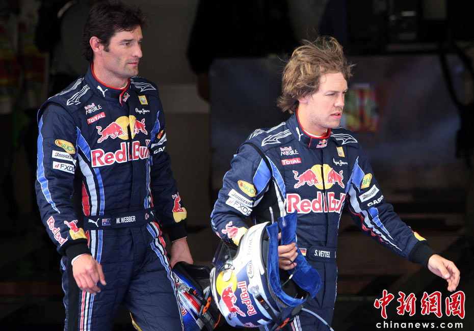 4月17日下午,2010國際汽聯(lián)F1世界錦標(biāo)賽上海站在上海國際賽車場舉行排位賽,代表紅牛車隊(duì)出戰(zhàn)的德國車手維特爾(右)獲得桿位,隊(duì)友、澳大利亞車手韋伯獲得第二名,法拉利車隊(duì)的西班牙車手阿隆索獲得第三名。中新社記者 任晨鳴 攝