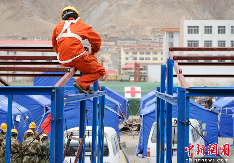 4月17日,青海玉樹體育場受災(zāi)民眾安置點,工人們安裝臨時板房。中新社發(fā) 廖攀 攝