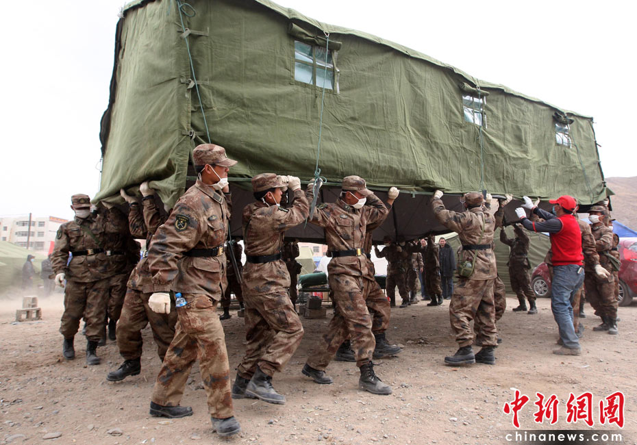 4月17日,青海玉樹(shù)體育場(chǎng)受災(zāi)民眾安置點(diǎn)內(nèi),解放軍救援隊(duì)為安置點(diǎn)整體搬遷帳篷。中新社發(fā) 盛佳鵬 攝
