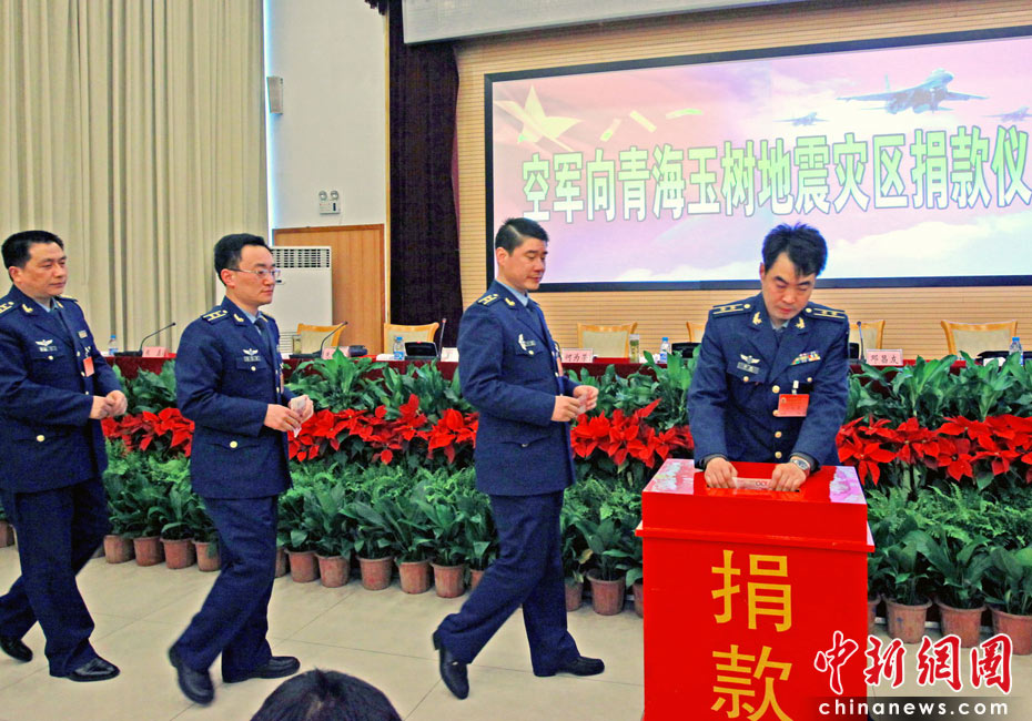 4月17日,中國空軍啟動(dòng)“空軍向青海玉樹地震災(zāi)區(qū)捐款儀式”,號(hào)召全空軍廣大官兵向?yàn)?zāi)區(qū)人民捐款。在當(dāng)天的捐款儀式上即捐款13萬多元。這些捐款將在空軍向玉樹捐款活動(dòng)結(jié)束后,統(tǒng)一送往災(zāi)區(qū)。中新社發(fā) 譚超 攝