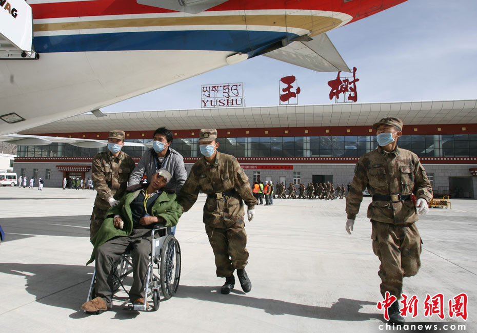 4月18日,青海省軍區(qū)救援隊在玉樹機(jī)場運送傷員。中新社發(fā) 蘇丹 攝
