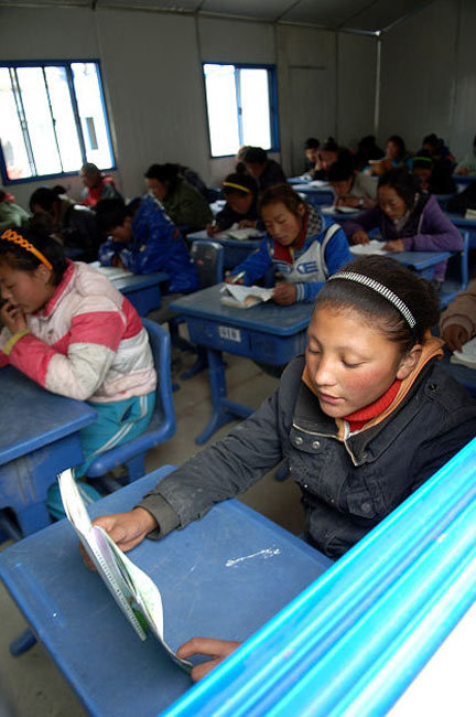 4月18日,70多名孩子在地震四天后重新走進(jìn)了課堂,玉樹(shù)州孤兒學(xué)校成為了地震災(zāi)區(qū)第一所復(fù)課的學(xué)校,剛完成帳篷搭建的青海省玉樹(shù)藏族自治州第一民族中學(xué)3個(gè)年級(jí)的學(xué)生也開(kāi)始復(fù)課。圖片來(lái)源:新華網(wǎng)