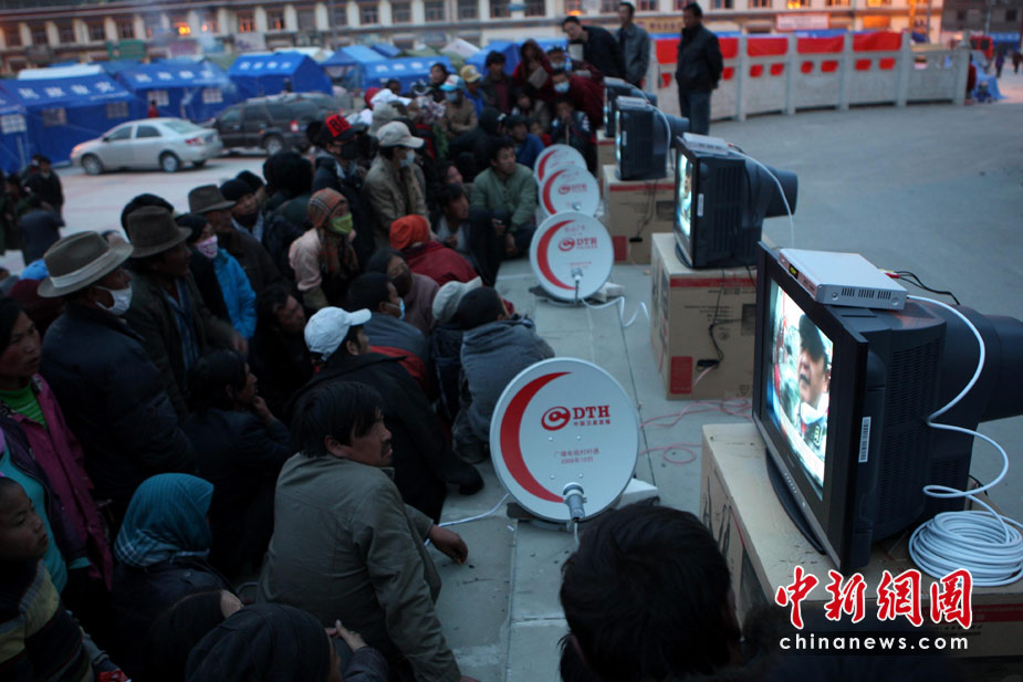 4月18日,青海玉樹結(jié)古鎮(zhèn)格薩爾王廣場,青海玉樹廣電系統(tǒng)為受災(zāi)民眾安裝了4臺電視機(jī),直播震災(zāi)救援的最新進(jìn)展。中新社發(fā) 盛佳鵬 攝