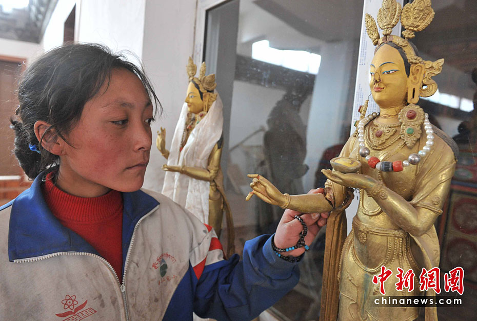 4月19日,新聞記者首次進(jìn)入青海玉樹7.1級強烈地震的震中點上拉秀鄉(xiāng)日麻村,奇跡是全村無一傷亡,位于村中心、正在新修的查榮寺里,兩尊文成公主的塑像局部損壞。中新社發(fā) 賈國榮 攝