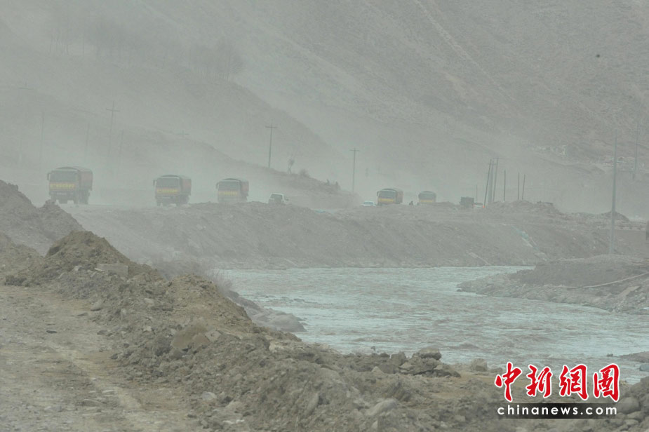 4月中旬青海玉樹地震災(zāi)區(qū)風(fēng)沙迷漫,中國各地軍民車隊(duì)在風(fēng)塵滾滾中馳援青藏高原偏僻一角的玉樹,艱難開通抗震救災(zāi)大通道。中新社發(fā) 賈國榮 攝