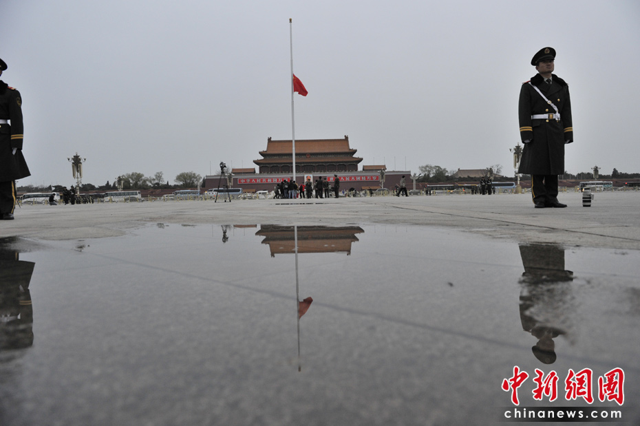 4月21日早晨,北京天安門(mén)廣場(chǎng)下半旗向玉樹(shù)地震遇難者致哀。中新網(wǎng)記者 金碩 攝