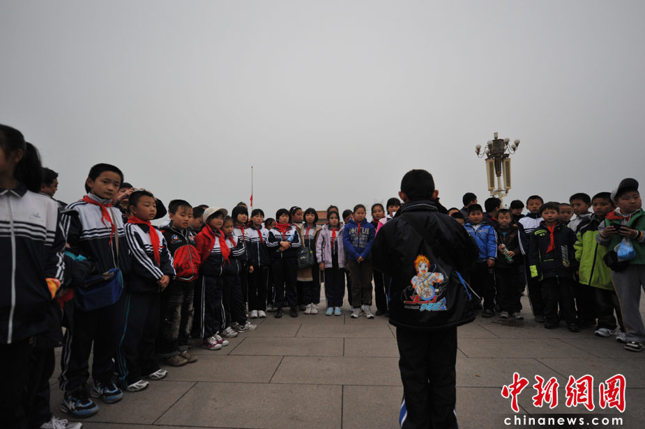 4月21日清晨,廊坊第十二小學的小學生來到天安門廣場朗讀自己的作文悼念青海玉樹地震的遇難同胞。中新網(wǎng)記者 金碩 攝