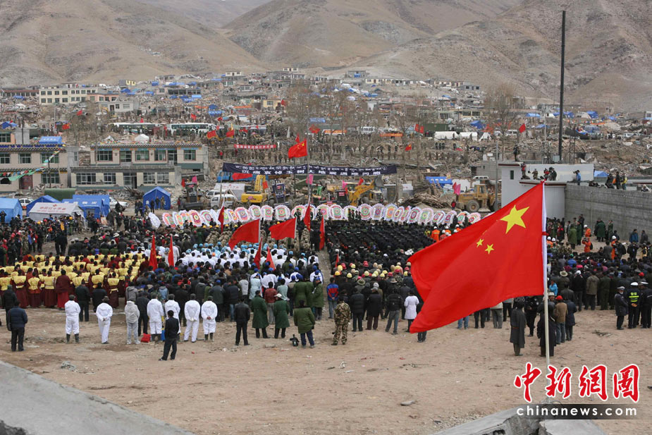 4月21日,為表達全國各族人民對青海玉樹地震遇難同胞的深切哀悼,中國國務院決定,舉行全國哀悼活動。圖為青海玉樹當?shù)孛癖娫谟駱淇h結(jié)古鎮(zhèn)鎮(zhèn)政府舉行哀悼活動。中新社發(fā) 蘇丹 攝