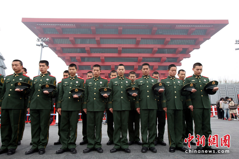 4月21日,上海世博園中國(guó)館前,負(fù)責(zé)警衛(wèi)工作的武警官兵向玉樹災(zāi)區(qū)遇難同胞肅立默哀。當(dāng)日,全國(guó)舉行哀悼活動(dòng),深切哀悼青海玉樹地震遇難同胞。 中新社發(fā) 張雷 攝