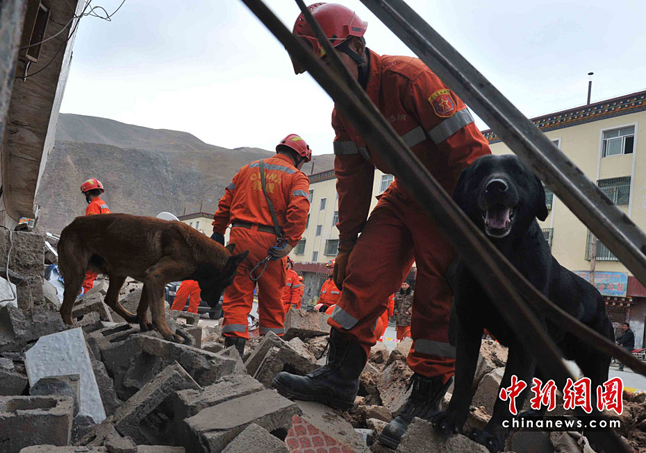 名貴的黑貝犬是中國國家救援隊趕赴青海玉樹地震災(zāi)區(qū)6只搜救犬隊成員之一,身價近百萬元人民幣。4月21日清晨八時許,它在救援隊員的帶領(lǐng)下,到玉樹地震災(zāi)區(qū)中心商業(yè)街廢墟里,四處奔波,盡職盡力尋找生命跡象。10時后,他和救援隊員都出現(xiàn)高原反應(yīng),暫時休整,準備再戰(zhàn)。賈國榮 攝