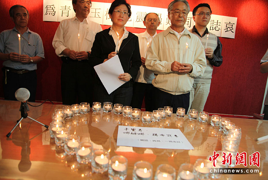 4月21日晚7時,中國統(tǒng)一聯(lián)盟在臺北以點燃蠟燭、3分鐘默哀、宣讀哀悼文等形式,與大陸同胞一起哀悼玉樹強(qiáng)震罹難者。前左為“統(tǒng)盟”主席紀(jì)欣,前右為勞動黨主席吳榮元。中新社發(fā) 董會峰 攝