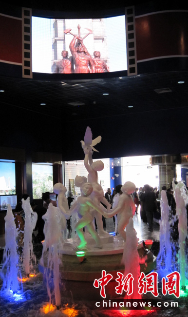 5月2日,上海世博會開園第二天,首次參展世博會的朝鮮館迎來人潮。圖為朝鮮館內(nèi)噴泉涌動,大屏幕上播放著介紹平壤主要景點的影片。中新社發(fā) 姜煜 攝