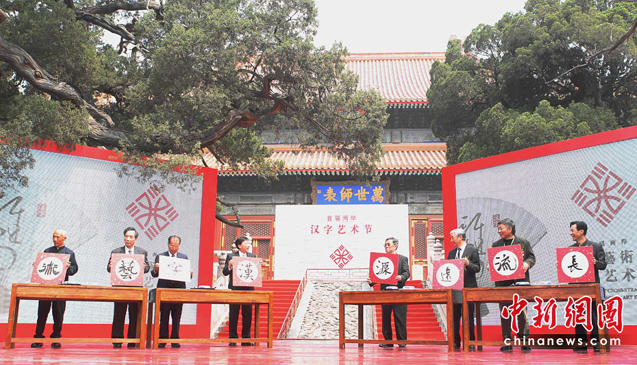 5月15日,首屆“兩岸漢字藝術(shù)節(jié)”新聞發(fā)布會(huì)在北京孔廟舉行。原文化部長(zhǎng)、著名作家王蒙與臺(tái)灣文化總會(huì)會(huì)長(zhǎng)劉兆玄等共同書寫漢字——“漢字藝術(shù)源遠(yuǎn)流長(zhǎng)”。 中新社發(fā) 蘇丹 攝