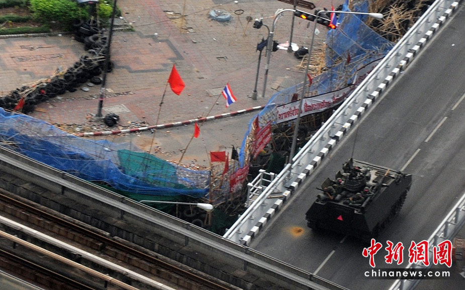19日清晨,數(shù)百名軍警在武裝車輛的掩護(hù)下向反政府示威者在曼谷的大本營聚集。自上周四紅衫軍與政府在曼谷爆發(fā)沖突以來,已經(jīng)導(dǎo)致39人死亡,數(shù)百人受傷。