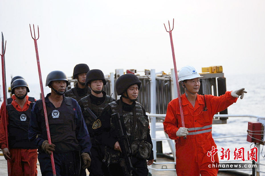 早晨和黃昏是海盜高發(fā)時(shí)段,特戰(zhàn)隊(duì)員與“嘉永山”輪反海盜小組聯(lián)合巡邏警戒。江山 攝