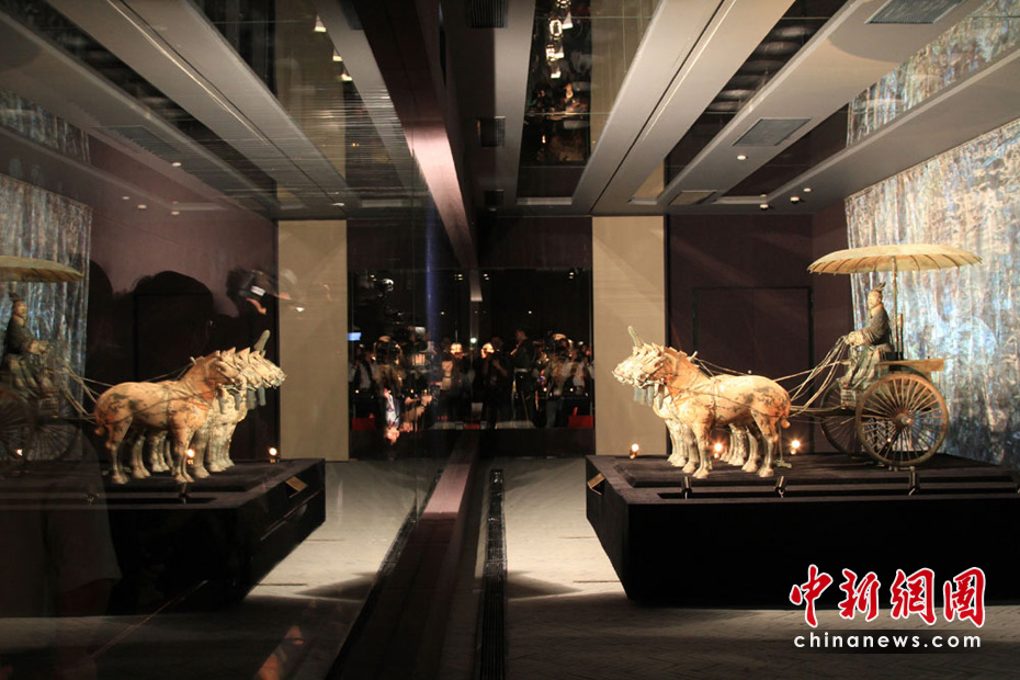 6月1日,秦始皇帝陵出土的“一號銅車馬”亮相世博會中國國家館,這是它出土30年以來第一次“駛出”陜西。這件國寶級文物在地下歷經(jīng)了2200多個(gè)春秋,于1980年出土,通體彩繪,為雙輪,單轅,駟馬系駕,總重約1061公斤。銅車馬共由3500多個(gè)零件組成,除一些金、銀飾件外,其余全部為青銅鑄件。中新社記者 殷春永 攝