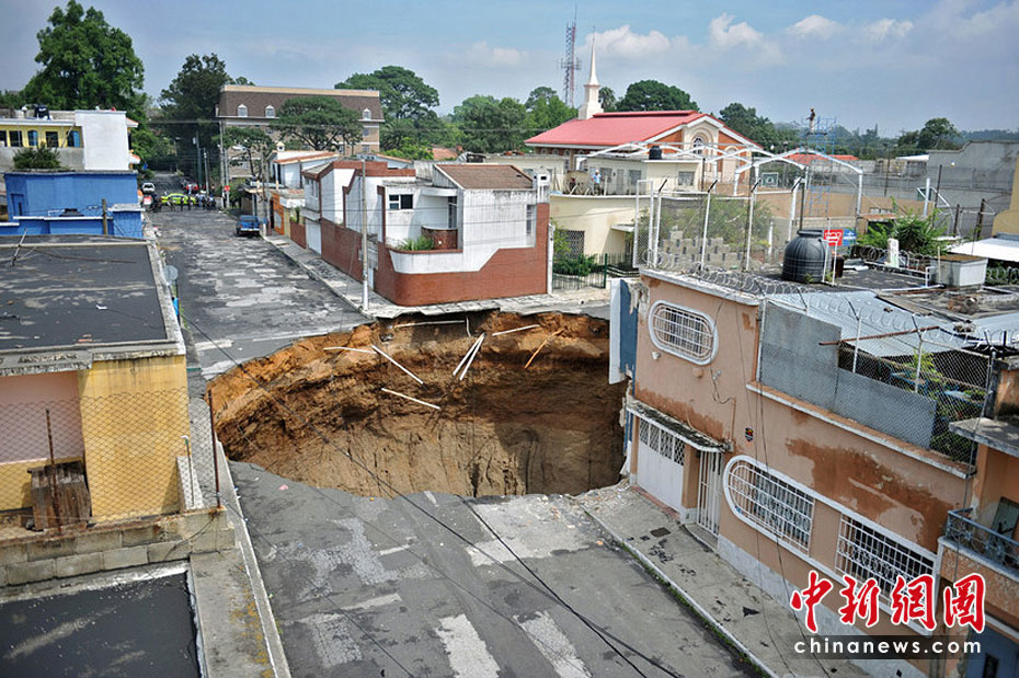 5月31日,受颶風(fēng)“阿加莎”的影響,危地馬拉首都危地馬拉城出現(xiàn)一個(gè)深達(dá)60米塌陷洞,有目擊稱一幢3層建筑墜入洞中,至少造成1人死亡。圖片來源:中國新聞網(wǎng)