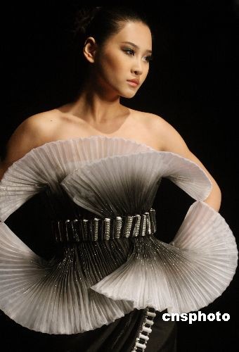 11月11日,北京中國國際時裝周2009春夏系列發(fā)布會推出董懷光高級時裝,創(chuàng)意來源于百年奧運,以奧運主體建筑結(jié)構(gòu)的完美與大氣,將宏大的盛況和千年文化底蘊及建筑優(yōu)美的幾何立體元素融入到設(shè)計構(gòu)思中。圖為模特展示董懷光高級時裝發(fā)布會作品。中新社發(fā) 錢興強 攝