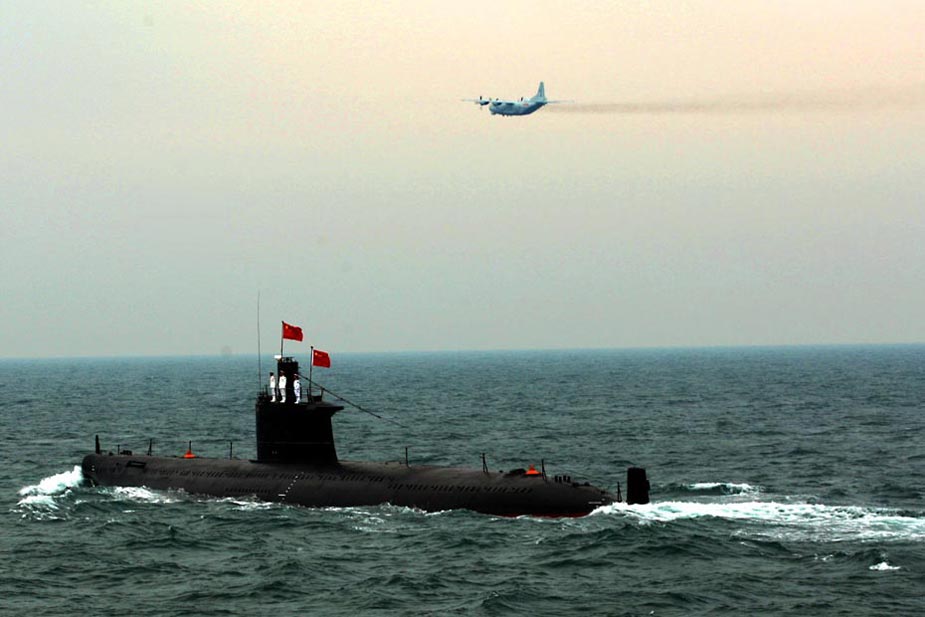 4月23日下午,為紀(jì)念中國人民解放軍海軍成立60周年而舉行的海上閱兵在青島附近黃海海域舉行。長征6號、長征3號核動力潛艇和長城218號、長城177號常規(guī)動力潛艇依次接受檢閱。 中新社發(fā) 宋吉河 攝