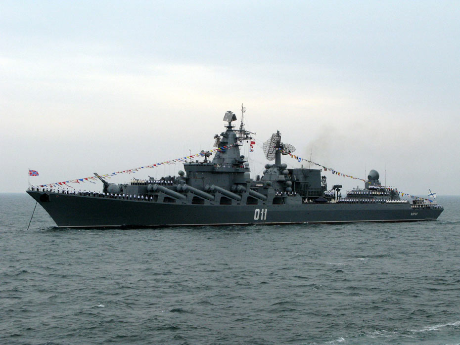 4月23日下午,為紀念中國人民解放軍海軍成立60周年而舉行的海上閱兵在青島附近黃海海域舉行。圖為舷號011俄羅斯“瓦良格”號導彈巡洋艦。 中新社發(fā) 琥珀旺旺 攝