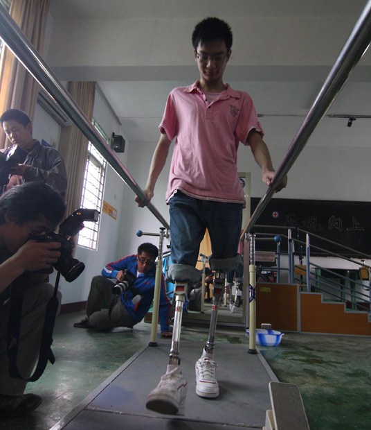 5月8日,“夾縫男孩”鄭海洋在四川省北川中學(xué)康復(fù)站進(jìn)行康復(fù)訓(xùn)練!皧A縫男孩”——北川中學(xué)高一學(xué)生鄭海洋在地震農(nóng)歷一周年5月2日重返校園,重新走入同學(xué)中間,開始新的生活。 在去年汶川大地震中,北川中學(xué)兩幢教學(xué)樓倒塌,正在高一·二班上課的鄭海洋與同桌廖波被同埋于水泥板下,22個(gè)小時(shí)后,鄭海洋獲救,付出的代價(jià)是他年輕健壯的雙腿。因與同桌廖波同埋于水泥板夾縫之中,被外界稱為“夾縫男孩”。將滿十八歲的鄭海洋,陽(yáng)光、帥氣?措娨、看書、上網(wǎng)是他的板房生活常態(tài),他穿戴假肢練習(xí)行走進(jìn)行康復(fù)訓(xùn)練,每次練習(xí)都要出一身大汗,F(xiàn)在的他已經(jīng)可以站立圍著板房區(qū)走一圈了。停學(xué)近一年的海洋進(jìn)入了新的高一·一班。母親跟他住在一間宿舍照顧他。新老師、新同學(xué)們也樂(lè)于關(guān)心他,為方便進(jìn)出專門安排他坐最后一排,下課時(shí),同學(xué)們會(huì)推著他到外面轉(zhuǎn)轉(zhuǎn)。學(xué)校給予鄭海洋每月三百元的生活補(bǔ)助,并在宿舍安排和生活上盡可能給予照顧。海洋穿上假肢可以行走,目前的臨時(shí)校區(qū)處在山坡地,上下坡假肢用不上力,只能坐輪椅。他希望即將開工的新北川中學(xué)能夠?yàn)闅埣矊W(xué)生設(shè)立更便利的無(wú)障礙通道。中新社發(fā) 郭國(guó)權(quán) 攝