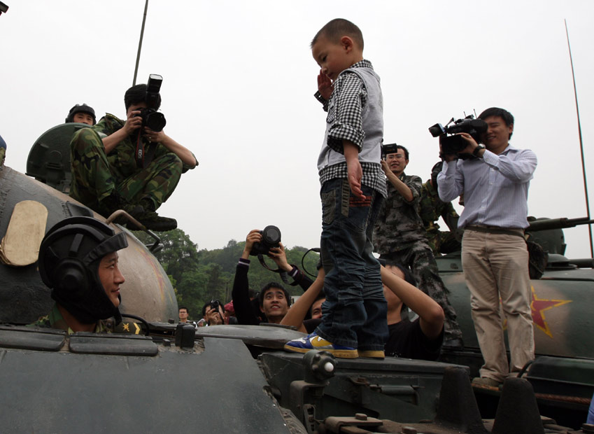 4月25日,汶川大地震幸存者“敬禮娃娃”郎崢一家來(lái)到成都軍區(qū)駐渝某部營(yíng)區(qū),感謝該部戰(zhàn)士在廢墟中救出郎崢的性命。2008年5月13日晨,3歲的郎崢被解放軍官兵從廢墟里救出后,躺在一塊小木板做的臨時(shí)擔(dān)架上,用他稚嫩的右手向8位抬著他的解放軍叔叔敬了個(gè)少先隊(duì)禮,他的舉動(dòng)引起社會(huì)各界高度關(guān)注,被媒體稱為“敬禮娃娃”。圖為郎崢在營(yíng)區(qū)內(nèi)見(jiàn)到夢(mèng)寐以求的坦克,爬到坦克車上用一個(gè)軍禮向解放軍叔叔表示感謝。中新社發(fā) 郭晉嘉 攝