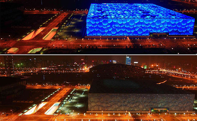 中國北京:3月28日,“水立方”燈光逐漸熄滅的過程。