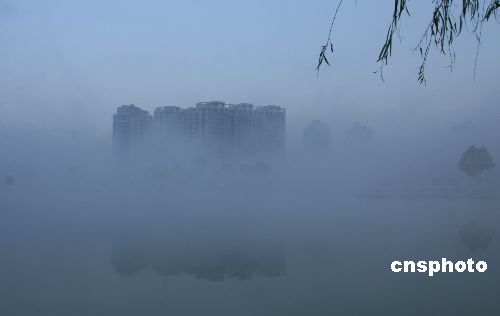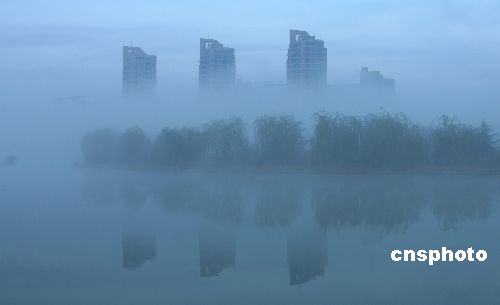 11月23日,進(jìn)入“小雪”節(jié)氣,浙江省天臺(tái)縣冬霧彌漫,城市的樹(shù)木、房屋籠罩在濃霧中,虛幻宛若海市蜃樓。中新社發(fā) 丁必裕 攝
