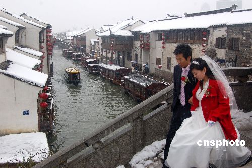 圖為一對(duì)新人前往古街山塘拍攝雪景留念。