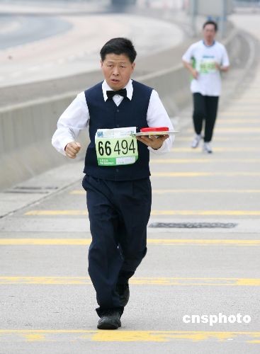 二月十七日,香港名氣最大的長跑賽事——渣打馬拉松賽開賽,約有超過四點九萬人參賽,創(chuàng)歷史新高。圖為一選手紳士打扮、手捧“紅心”在隊伍中十分搶眼。中新社發(fā) 武仲林 攝