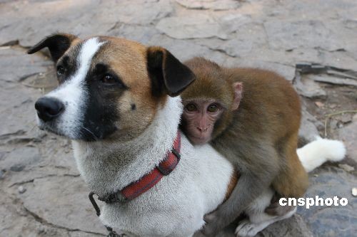 2008年10月12日,猴寶寶緊緊抱住自己的狗“爸爸”。在河南省焦作市人民公園的人造猴山里,有一只從小失去了父母的猴寶寶經(jīng)常受到其他猴子的欺負(fù),幾次險(xiǎn)些喪命。為了能讓這只小猴活下來(lái),飼養(yǎng)員在猴山中放進(jìn)了一只公狗,取名“賽虎”,希望它能擔(dān)當(dāng)起保護(hù)猴寶寶的重任!百惢ⅰ彼坪趵斫饬酥魅说囊馑,從此與猴寶寶形影不離,遇到哪只猴子欺負(fù)猴寶寶,它會(huì)毫不猶豫的沖出去保護(hù)自己的猴寶寶!百惢ⅰ边清楚哪只猴子是猴王,從來(lái)不讓猴王接近猴寶寶一步,它甚至還當(dāng)起了猴世界的警察,當(dāng)遇到猴王欺負(fù)其他猴子的時(shí)候,它一樣會(huì)上前制止。一只狗維持了猴世界的秩序,難得一見(jiàn)的猴寶寶認(rèn)狗為“父”,吸引了許多游客前來(lái)觀看。中新社發(fā) 唐玉磊 攝