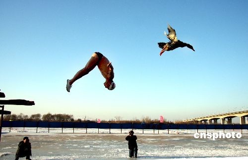 12月10日,在松花江上,黑龍江省冬泳協(xié)會(huì)新開設(shè)的冬泳池內(nèi),游客正在觀看人鴨共舞的跳水表演。游人掌聲不斷。據(jù)悉,今年入冬以來鴨子天天在冬泳池內(nèi)戲水游泳,冬泳人讓鴨子跳水是為了鍛煉它的飛行能力,也希望能成為冬泳的又一新看點(diǎn)。中新社發(fā) 姚庭山 攝