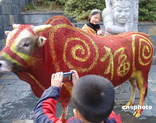 牛年春節(jié)將近,長沙世界之窗內(nèi)愛玩的孩子們圍著一頭黃牛,為它涂上絢麗的色彩,形成創(chuàng)意十足的“福”字圖案,用時(shí)尚的彩牛迎接即將到來的牛年春節(jié)。中新社發(fā) 肖前輝 攝