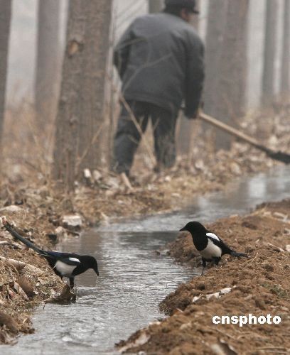 2月6日,河南洛陽嵩田湖鎮(zhèn)農(nóng)民引來嵩伊渠水流灌溉干旱的油菜地,一些喜鵲也趁機(jī)追逐水流,嬉戲解渴。中新社發(fā) 張曉理 攝