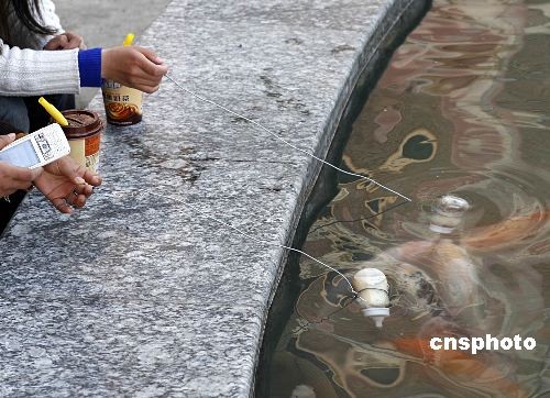 3月中旬,工作人員喂養(yǎng)“喝奶”的魚。在浙江東陽橫店影視城香港街景點內(nèi),養(yǎng)在水壇中的觀賞錦鯉是普通錦鯉與日本某錦鯉雜交后培育的品種,喂養(yǎng)它們則需要將飼料裝灌進嬰幼兒奶瓶中,該飼料的顏色如“乳奶”一般,然后將奶瓶用鐵絲系住放入水中,隨后,這些魚兒就會圍攏過來,爭搶著用奶嘴吸“奶”喝了。