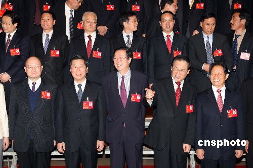 十月十九日,出席中共十七大的中央金融系統(tǒng)代表在駐地合影留念。前排從左至右為國(guó)家開(kāi)發(fā)銀行行長(zhǎng)陳元、證監(jiān)會(huì)主席尚福林、中國(guó)人民銀行行長(zhǎng)周小川、銀監(jiān)會(huì)主席劉明康、保監(jiān)會(huì)主席吳定富。中新社發(fā) 毛建軍 攝