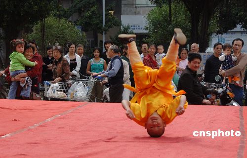 10月22日,隨鄭州市旅游局來福州推介鄭州名勝的少林寺八齡童武僧,表演武功絕活,技驚四座。時值旅游旺季,擁有少林寺、黃河風(fēng)景區(qū)、杜甫故居、商城遺址公園、嵩陽書院等勝景的“河南旅游”引起福州市民關(guān)注。中新社發(fā) 鄭祚聲 攝