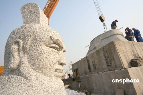 11月6日,由北京運(yùn)抵許昌魏武帝廣場的曹操雕像開始組裝安放。這座曹操像高度6.95米,像身重量近200噸,底部積座的長度和寬度均為5米,通身采用耐風(fēng)化、不變色的花崗巖雕刻而成,半月左右可全部安裝完畢。據(jù)了解,該座雕像由中央美院雕塑系教授段?档葘<医(jīng)數(shù)次設(shè)計(jì),歷經(jīng)多個(gè)環(huán)節(jié)最終完成。中新社發(fā) 牛書培 攝