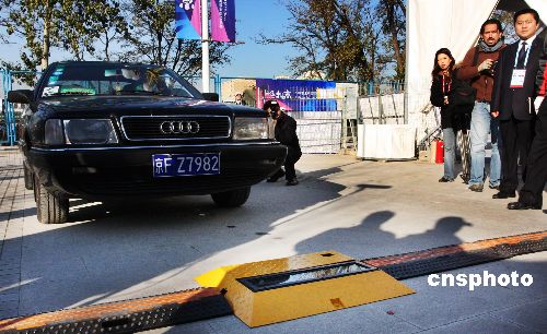 11月16日,北京奧運場館安保工作面向境內(nèi)外記者開放,一百余位記者在2008奧運柔道賽館——北京科技大學體育館體驗了快速車檢和人身安檢。北京奧運安保協(xié)調(diào)小組辦公室常務副主任、奧運安保指揮中心常務副總指揮劉紹武在現(xiàn)場介紹,一部X光機和兩部安檢門為一套系統(tǒng),在一小時內(nèi)可完成對八百名觀眾的安全檢驗,平均不到五秒鐘可放行一人。中新社發(fā) 鄭雄增 攝