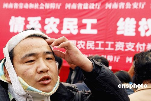 2007年11月30日,鄭州市紫荊山廣場舉辦“情系農(nóng)民工、維權(quán)促和諧——現(xiàn)場受理農(nóng)民工工資支付舉報投訴活動”,活動由河南省勞動和社會保障廳、省建設(shè)廳、省公安廳、省交通廳、省總工會等聯(lián)合主辦,全省各地市同時進行;顒游吮姸嗟霓r(nóng)民工現(xiàn)場投訴,從而拉開了春節(jié)前河南省為農(nóng)民工維權(quán)活動的序幕。中新社發(fā) 馬健 攝