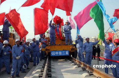 12月16日,備受關(guān)注的中國(guó)大陸首條高等級(jí)城際鐵路——京津城際快速鐵路鋪軌工程,繼12月10日北京區(qū)率先鋪通后,天津區(qū)亦宣告完成?偼顿Y133.24億元的京津城際快速鐵路工程,于2005年7月4日開(kāi)工,計(jì)劃2008年第一季度開(kāi)始綜合調(diào)試及試運(yùn)營(yíng),北京奧運(yùn)會(huì)開(kāi)幕前正式開(kāi)通運(yùn)營(yíng)。京津城際快速鐵路建成通車(chē)后,將實(shí)現(xiàn)京津兩地30分鐘內(nèi)通達(dá)。中新社發(fā) 段毅剛 攝
