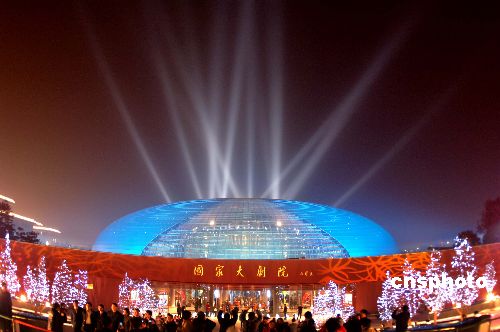 12月20日,北京國(guó)家大劇院測(cè)試首個(gè)演出季的外部燈光效果,藍(lán)色的燈光和背后高功率射燈將國(guó)家大劇院裝扮得夢(mèng)幻迷人。據(jù)悉,本次開(kāi)幕國(guó)際演出季將從2007年12月22日持續(xù)到2008年4月6日,期間將有78個(gè)劇目、180場(chǎng)精彩演出在這里隆重上演,其中三分之一為國(guó)外劇目,涵蓋了歌劇、舞劇、音樂(lè)會(huì)、話劇、民族戲曲五大藝術(shù)門(mén)類,預(yù)計(jì)接納觀眾30萬(wàn)人次。中新社發(fā) 廖攀 攝
