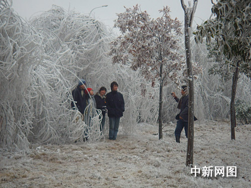 在海拔約八百米的京珠高速公路廣東韶關(guān)乳源、樂昌路段,沿途山野一片白茫茫,早些天仍綠葉婆娑的樹木也披上銀妝,掛上冰飾。京珠高速樂昌云巖服務(wù)區(qū)內(nèi),幾個年輕人在冰清玉潔的樹掛前留戀往返。