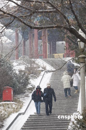 1月17日,北京景山公園的游人踏雪游玩,興致不減。當日,北京迎來了2008年的第一場降雪,伴著寒風,小雪很快灑滿了京城的大街小巷。中新社發(fā) 杜洋 攝