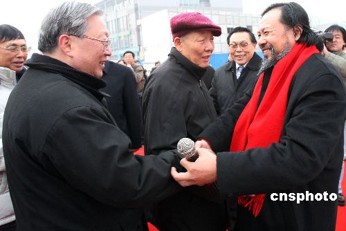 圖為全國人大副委員長、中國科學(xué)院院長路甬祥與雕塑藝術(shù)家遙遠雕塑(右)先生握手表示祝賀。