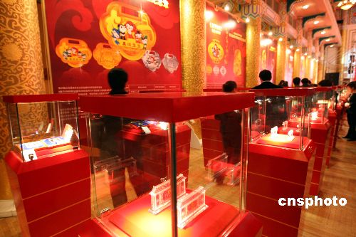 一月二十日,為紀(jì)念奧運(yùn)會倒計(jì)時200天,由北京奧組委主辦的主題為“中國印·奧運(yùn)年·華夏!眾W運(yùn)特許貴金屬賀歲新品上市推介會舉行。七十款具有中國特色的奧運(yùn)特許商品,包括中國印、長命鎖、紅燈籠、中國結(jié)及中國福等。中新社發(fā) 任海霞 攝