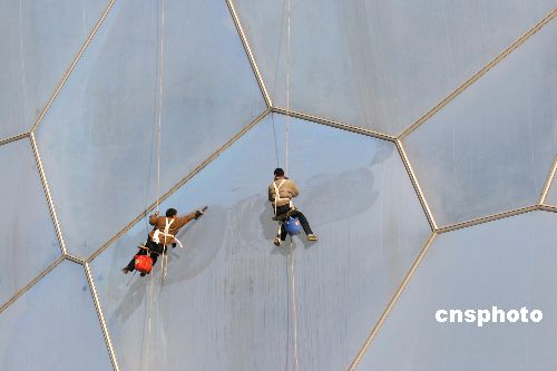 兩名工人正在清洗北京奧運(yùn)會(huì)游泳館“水立方”的外墻膜。