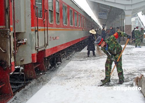 2008年1月27日,湖北宜昌再次普降大雪,宜昌市火車站積極迎戰(zhàn)大雪保鐵路春運(yùn)安全,讓旅客旅途平安。中新社發(fā) 劉君鳳 攝