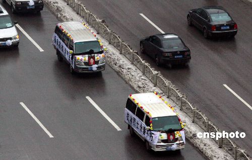 1月30日上午,長沙民眾送別在雪災中因除凍搶修電路殉職的湖南三位電力員工。據(jù)悉,三位烈士于1月26日在長沙電廠至沙坪變電站五百千伏線路上人工除冰時,因線路覆冰太厚、鐵塔不堪重負從50余米的高空墜地,周景華當場殉職,羅海文、羅長明被緊急送往醫(yī)院后搶救無效身亡。正在湖南視察雪災災情的國務(wù)院總理溫家寶29日專程看望了烈士家屬。
